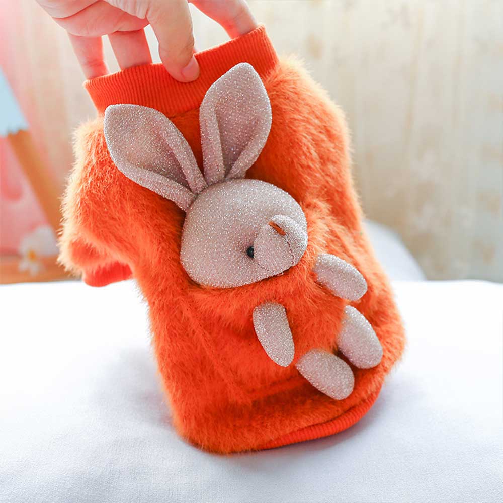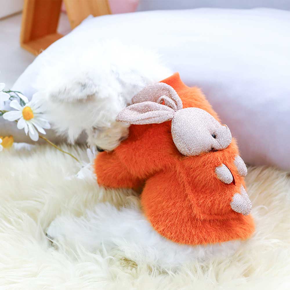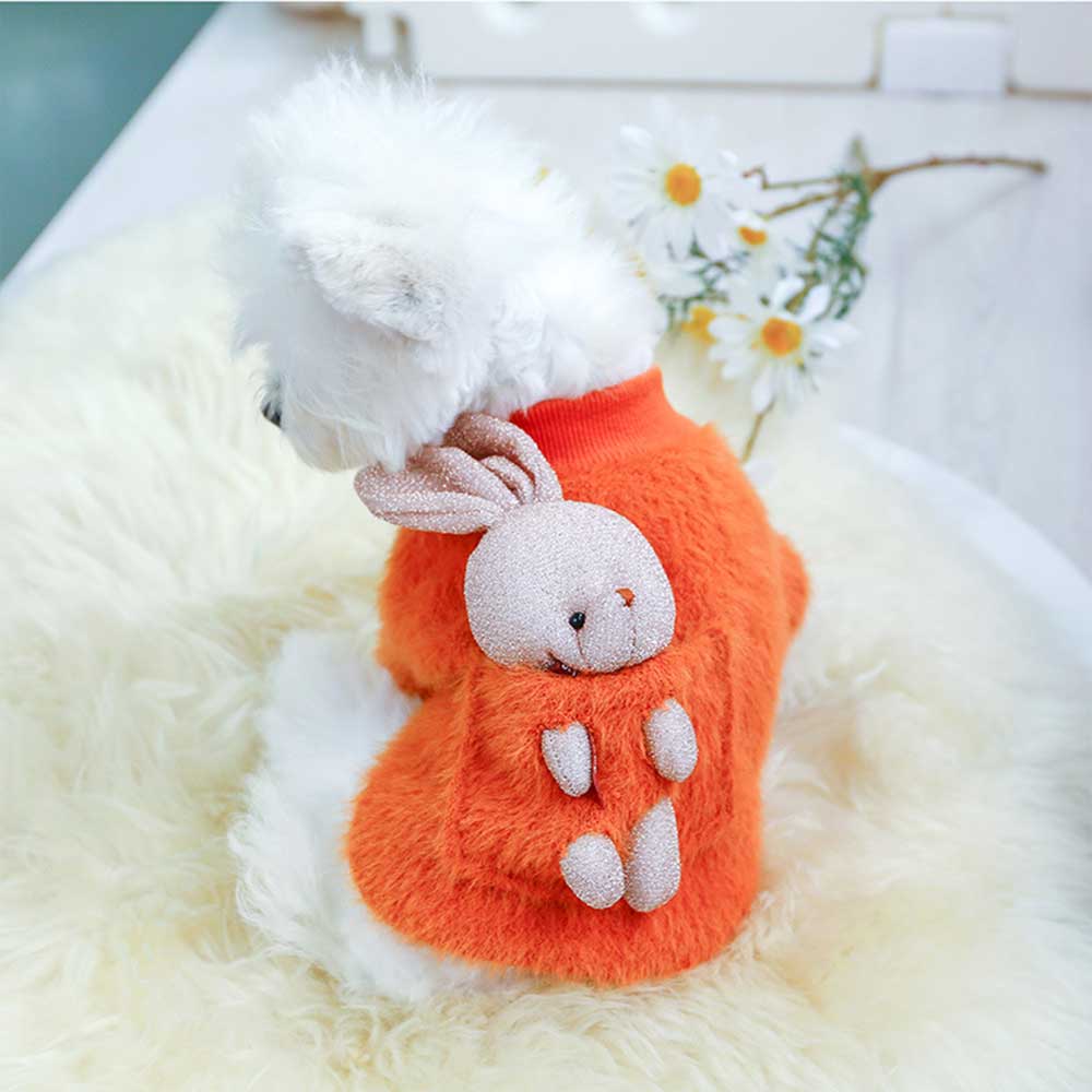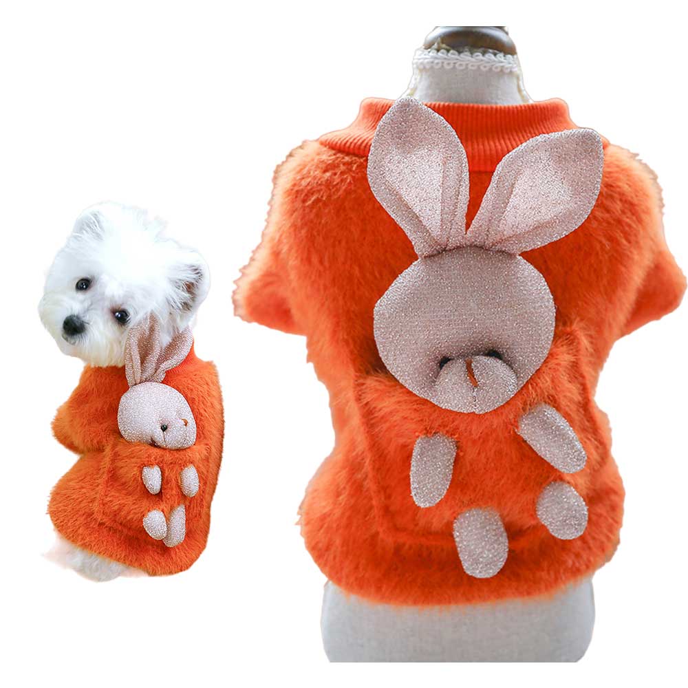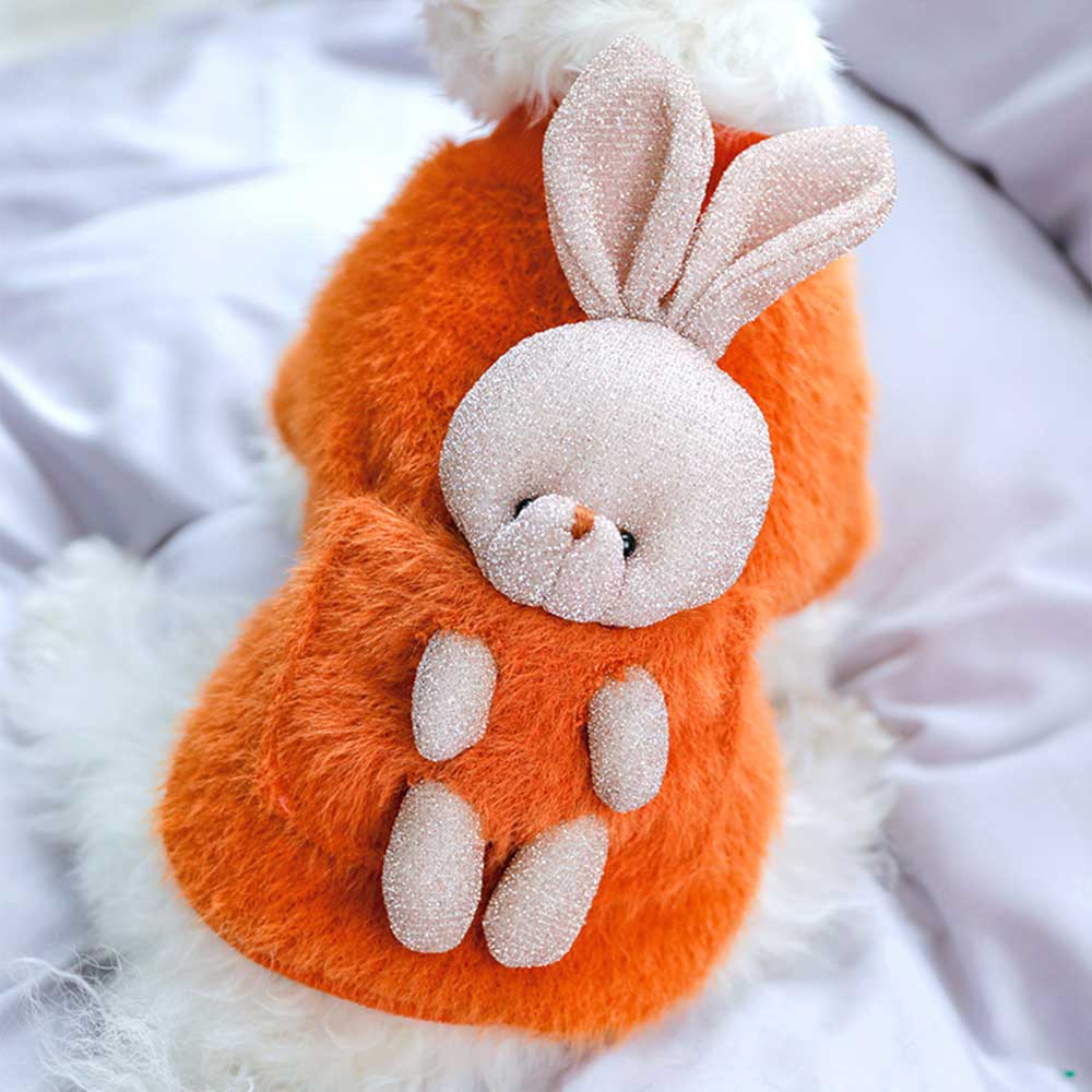 Bluza pufoasă portocalie pentru căței oferă căldură și confort în zilele răcoroase, având un design vesel și atrăgător. Pe spate este un iepuraș simpatic, care adaugă o notă jucăușă și prietenoasă. Materialul moale și pufos asigură protecție termică, iar croiala lejeră nu limitează libertatea de mișcare a micuțului tău companion.