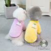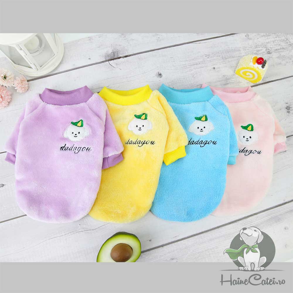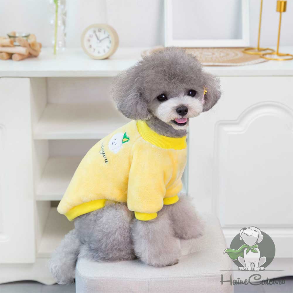 Bluza pufoasă galbenă pentru căței are pe spate o față simpatică a unui cățeluș alb, purtând o șapcă, alături de mesajul „Dadagou”. Materialul moale și călduros oferă confort termic, iar croiala lejeră permite libertate de mișcare, fiind ideală pentru plimbări în zilele reci.
