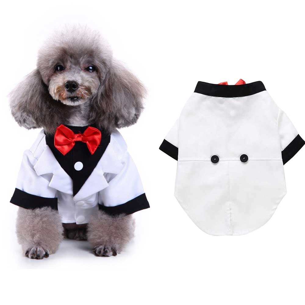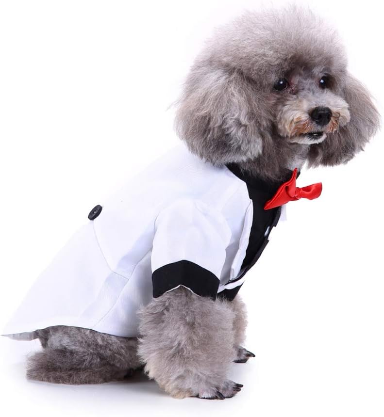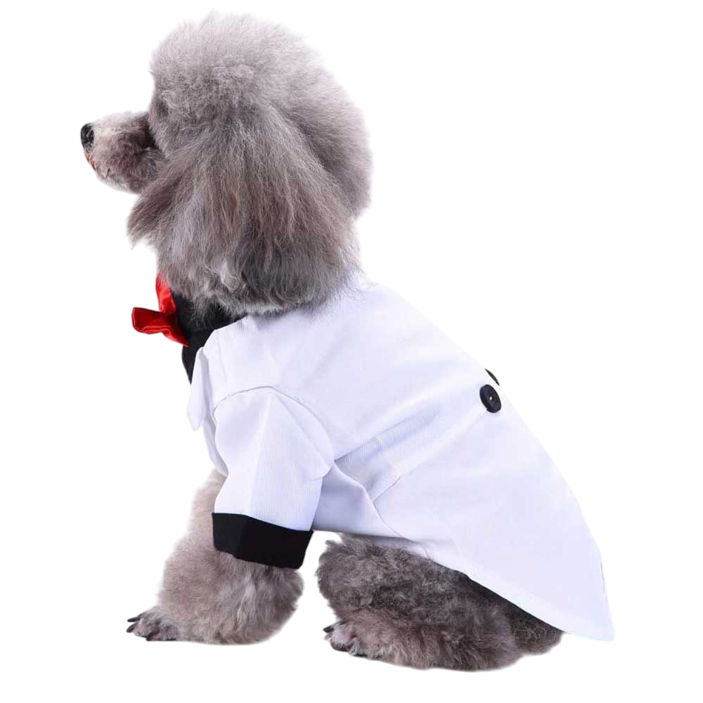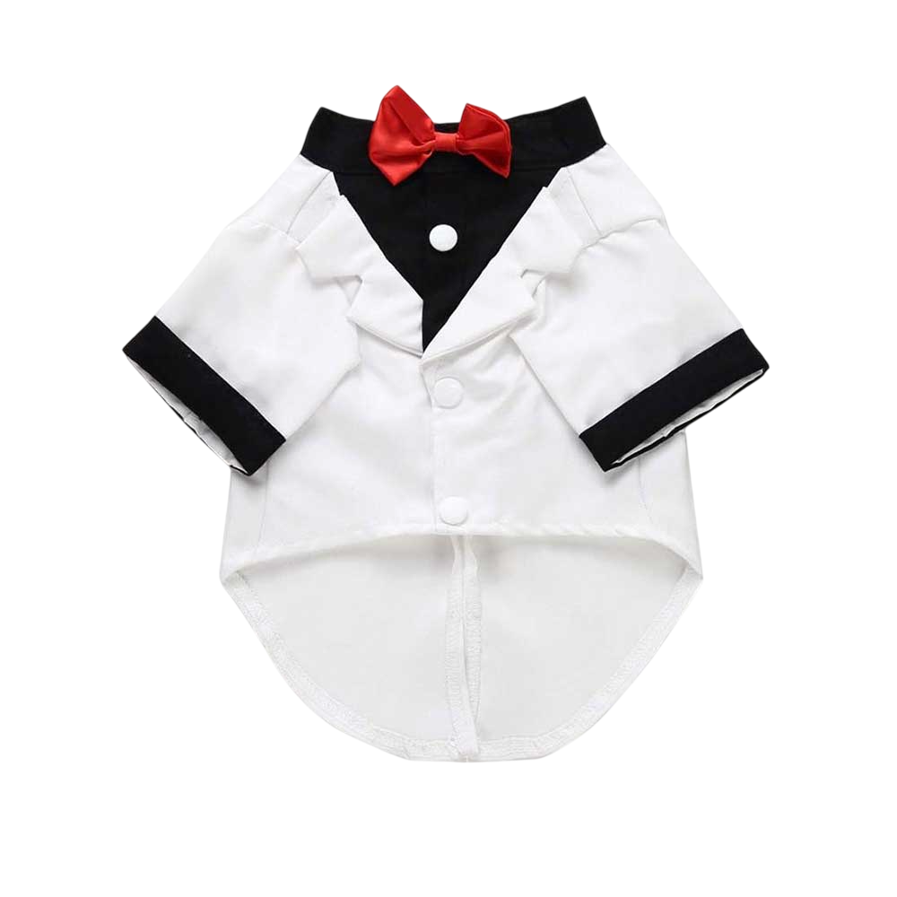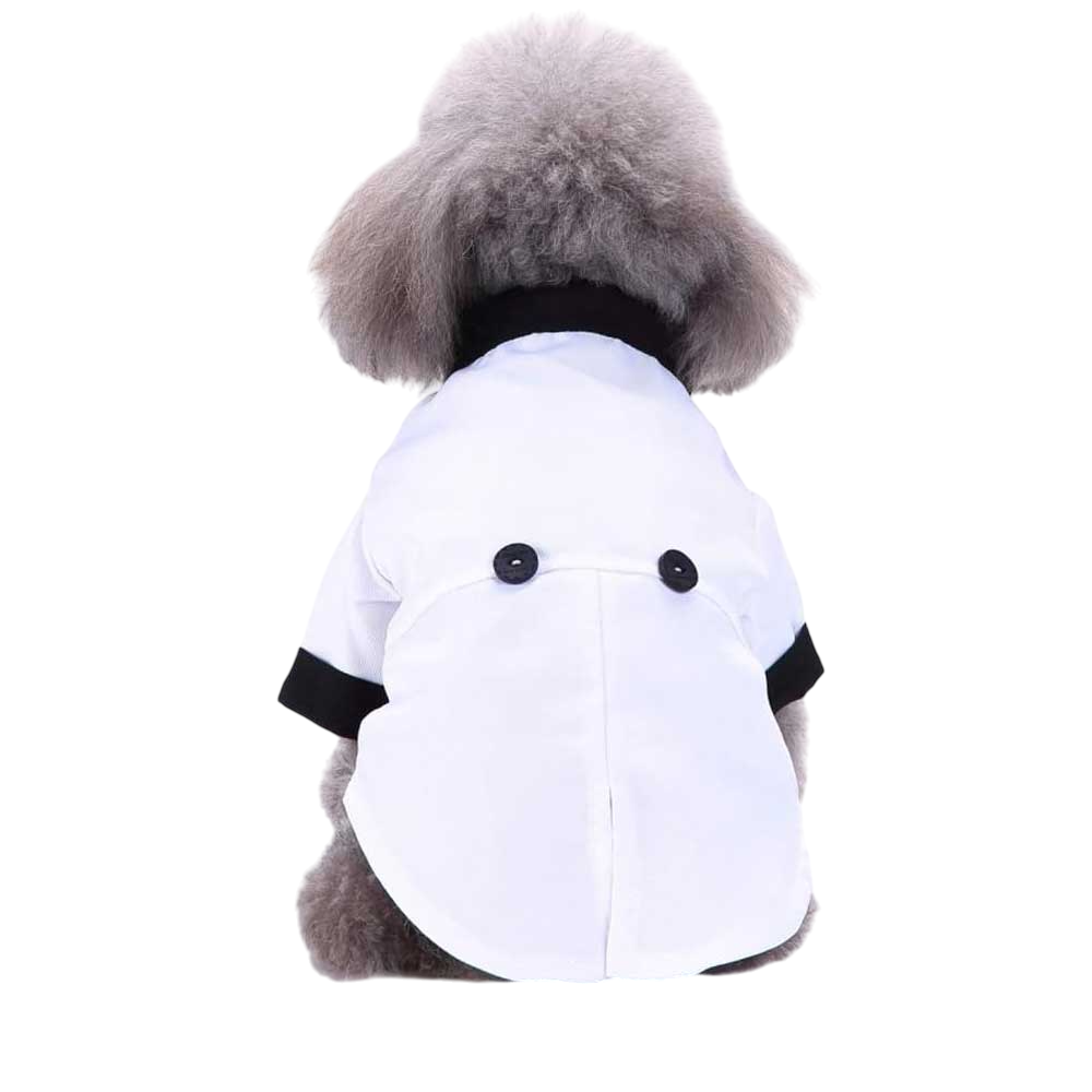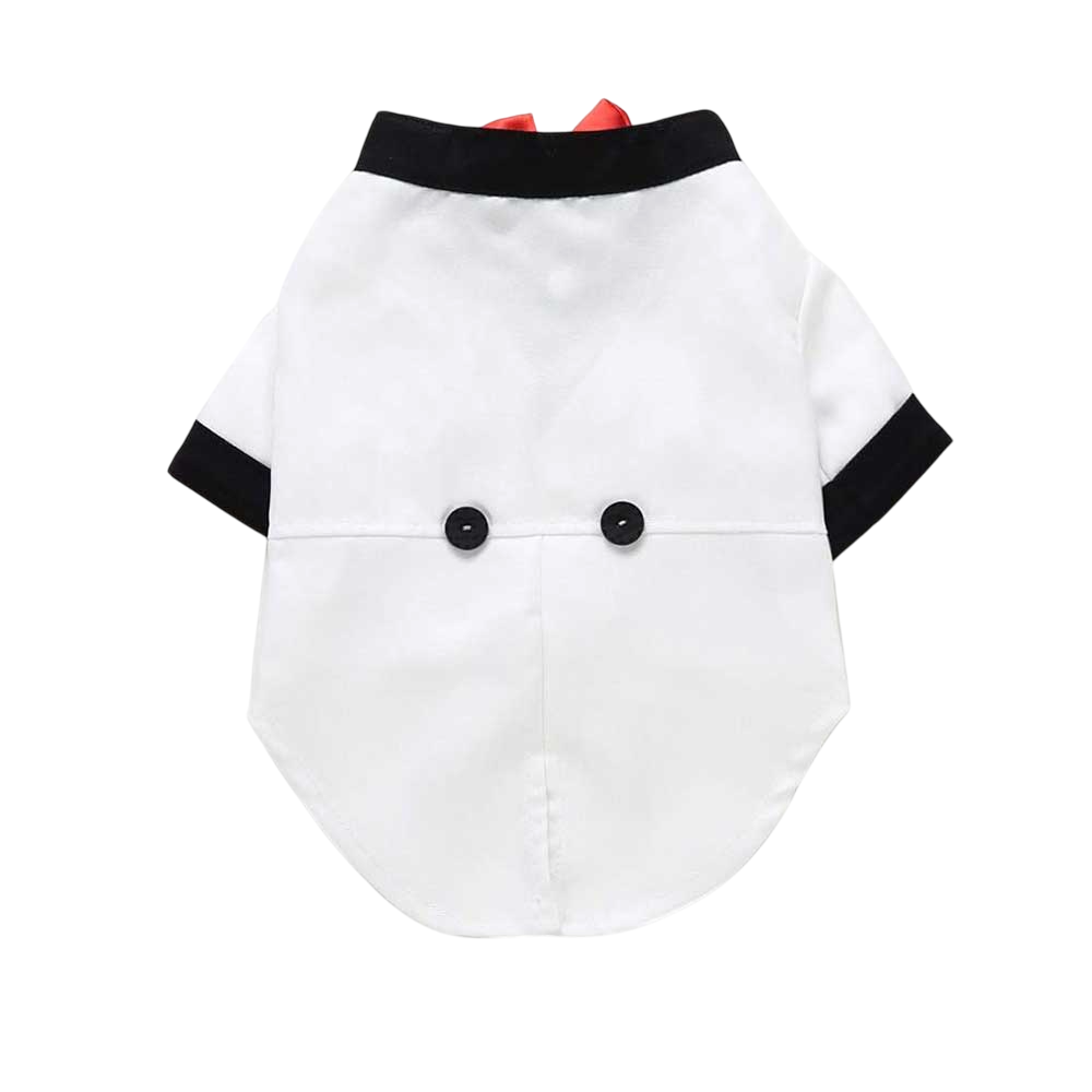 Costumul pentru căței alb, emană eleganță și rafinament. Este accesorizat cu un papion rosu și are un guler tip cămașă negru, pentru un aspect clasic și distins. Pe spate, doi nasturi decorativi completează ținuta, transformând cățelul tău în adevăratul gentleman al oricărei ocazii speciale.