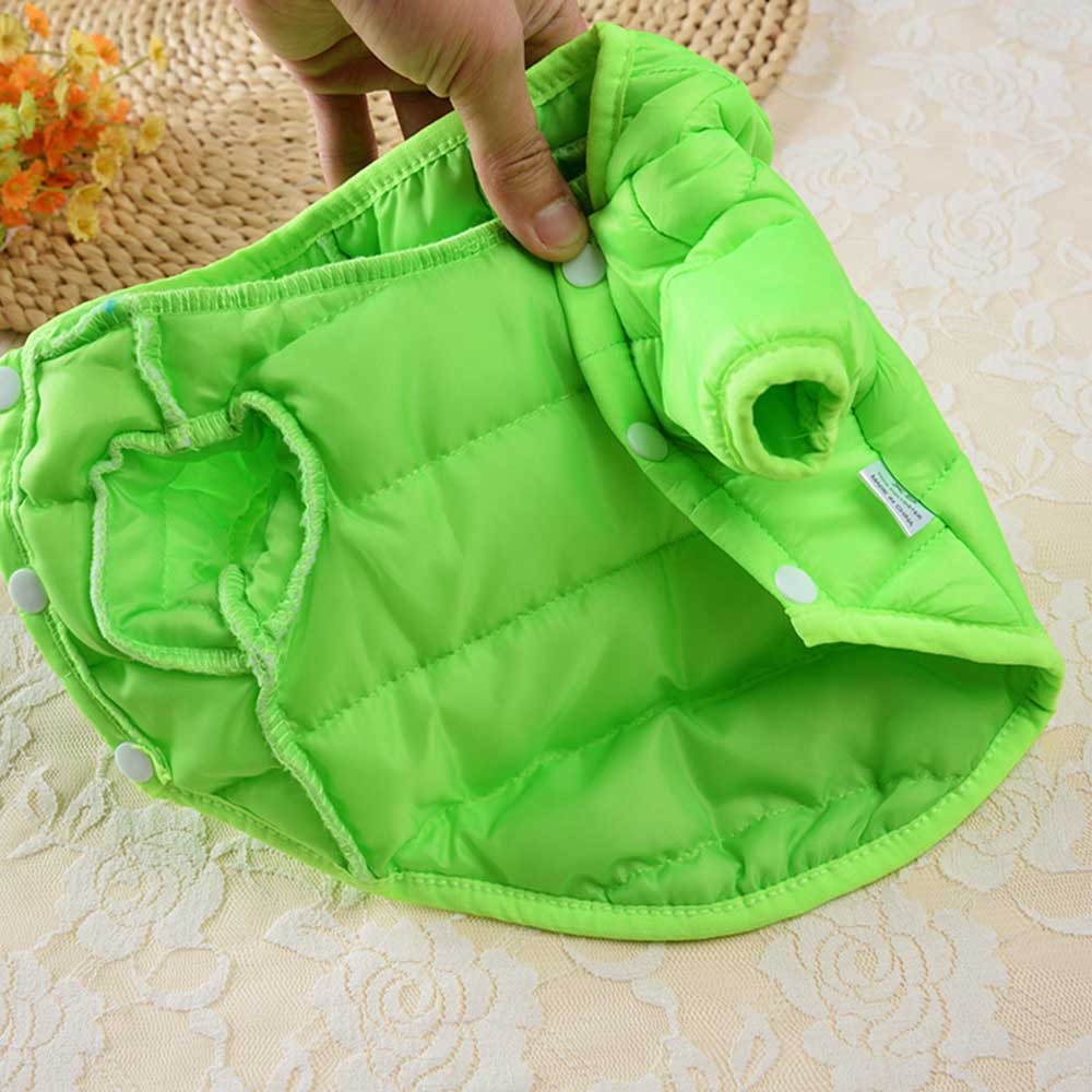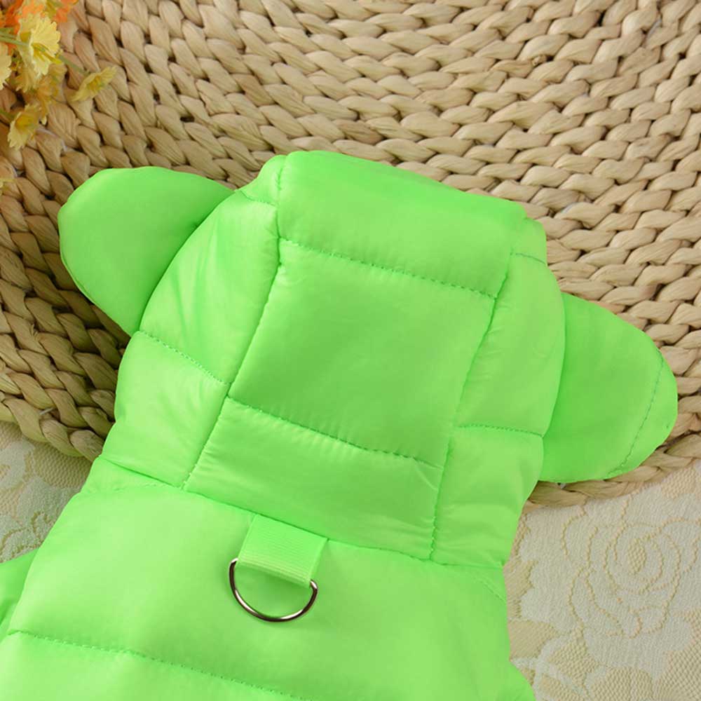 Geacă matlasată, impermeabilă, cu glugă pentru căței, într-o nuanță delicată de verde, perfectă pentru plimbările în sezonul rece. Gluga este accesorizată cu urechiușe drăgălașe, iar închiderea practică cu capse pe burtică face îmbrăcarea ușoară și rapidă.