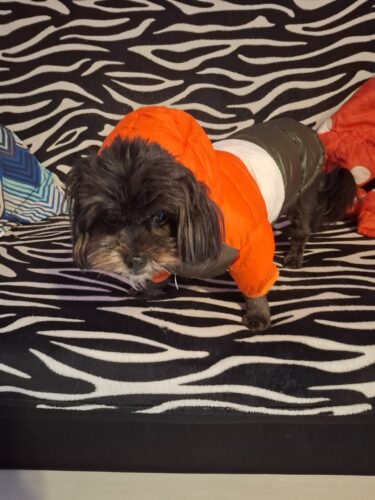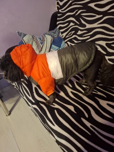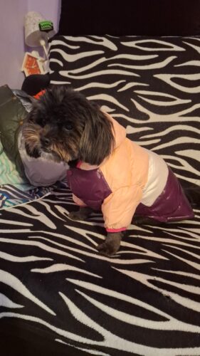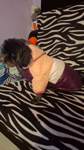 Geacă impermeabilă pentru câini, în nuanțe de roz, alb și roz închis, perfectă pentru zilele răcoroase și ploioase. Este decorată cu un patch pe spate și un șnur reglabil care adaugă un plus de stil și funcționalitate. Se închide ușor cu capse pe burtică.