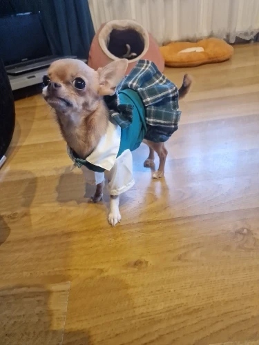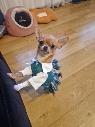 Rochiță adorabilă pentru căței, cu design elegant în alb și verde, guler tip cămașă și fundiță decorativă la spate — perfectă pentru un look chic și delicat.
