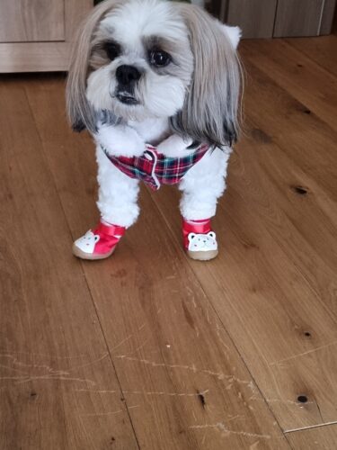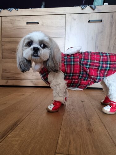 Această rochiță îmblănită pentru câini îmbină căldura cu eleganța, având un interior moale și pufos și un exterior cu imprimeu în carouri. Fundița decorativă de pe spate ascunde discret un inel pentru prinderea lesei, iar gulerul din blăniță și închiderea cu capse pe piept completează perfect designul funcțional și stilat.