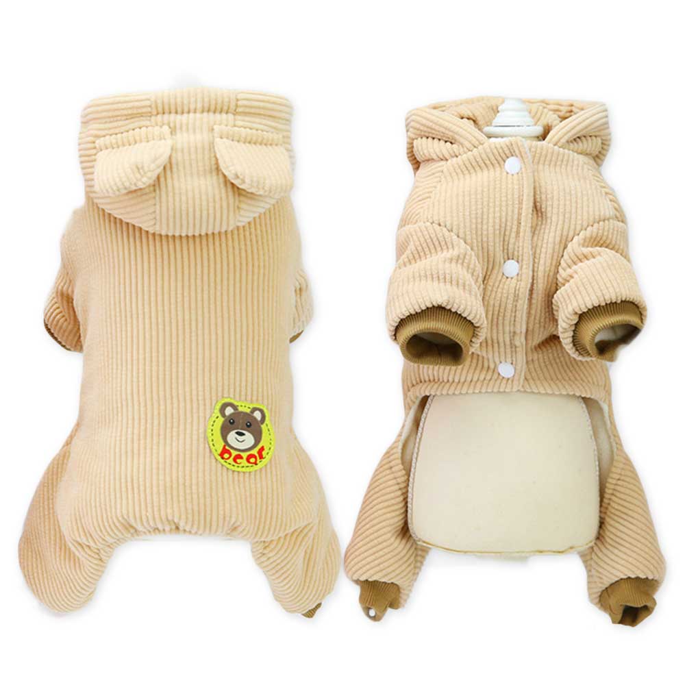 Salopeta îmblănită cu glugă crem este alegerea perfectă pentru cățeii care au nevoie de căldură și un plus de stil în sezonul rece. Pe spate este aplicat un patch adorabil cu un ursuleț, care adaugă un detaliu jucăuș și plin de farmec. Gluga protejează capul de frig, iar închiderea cu capse pe burtică permite o îmbrăcare rapidă și comodă.