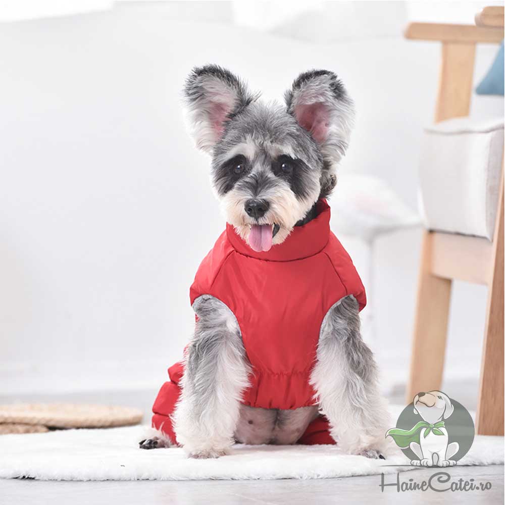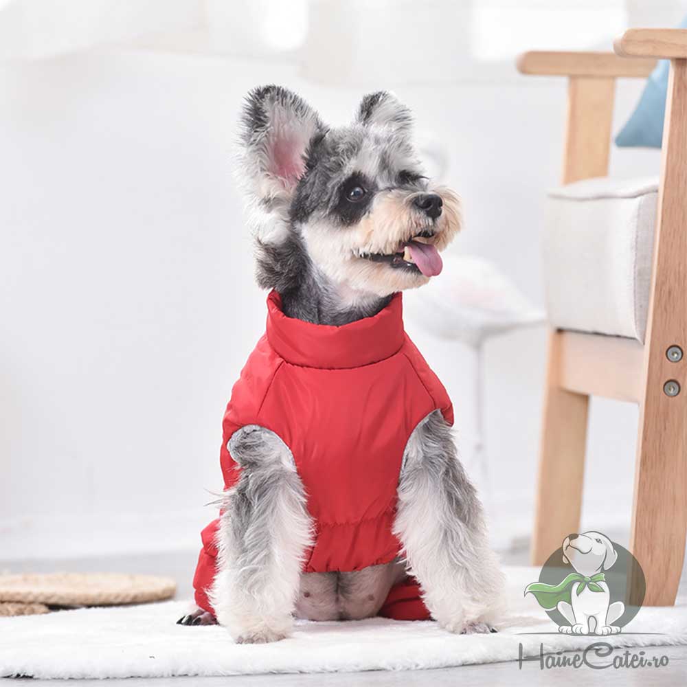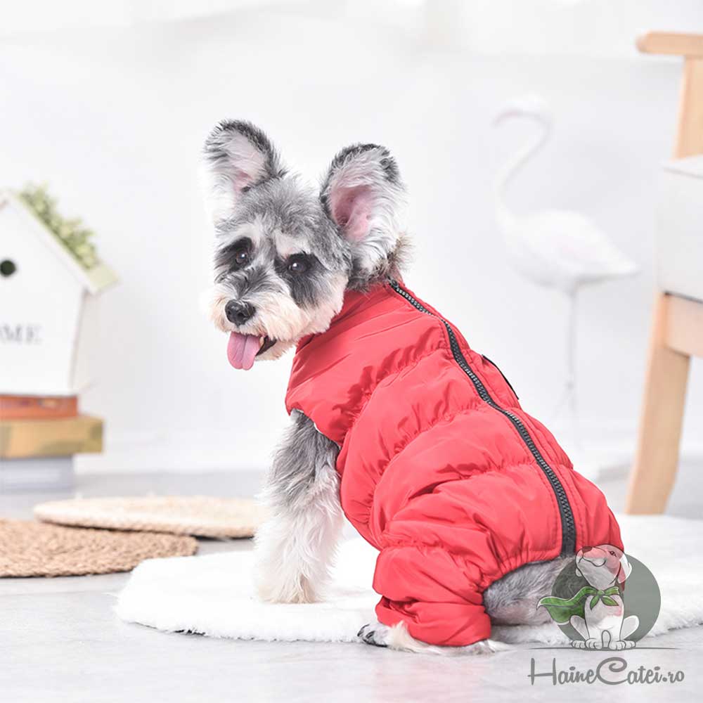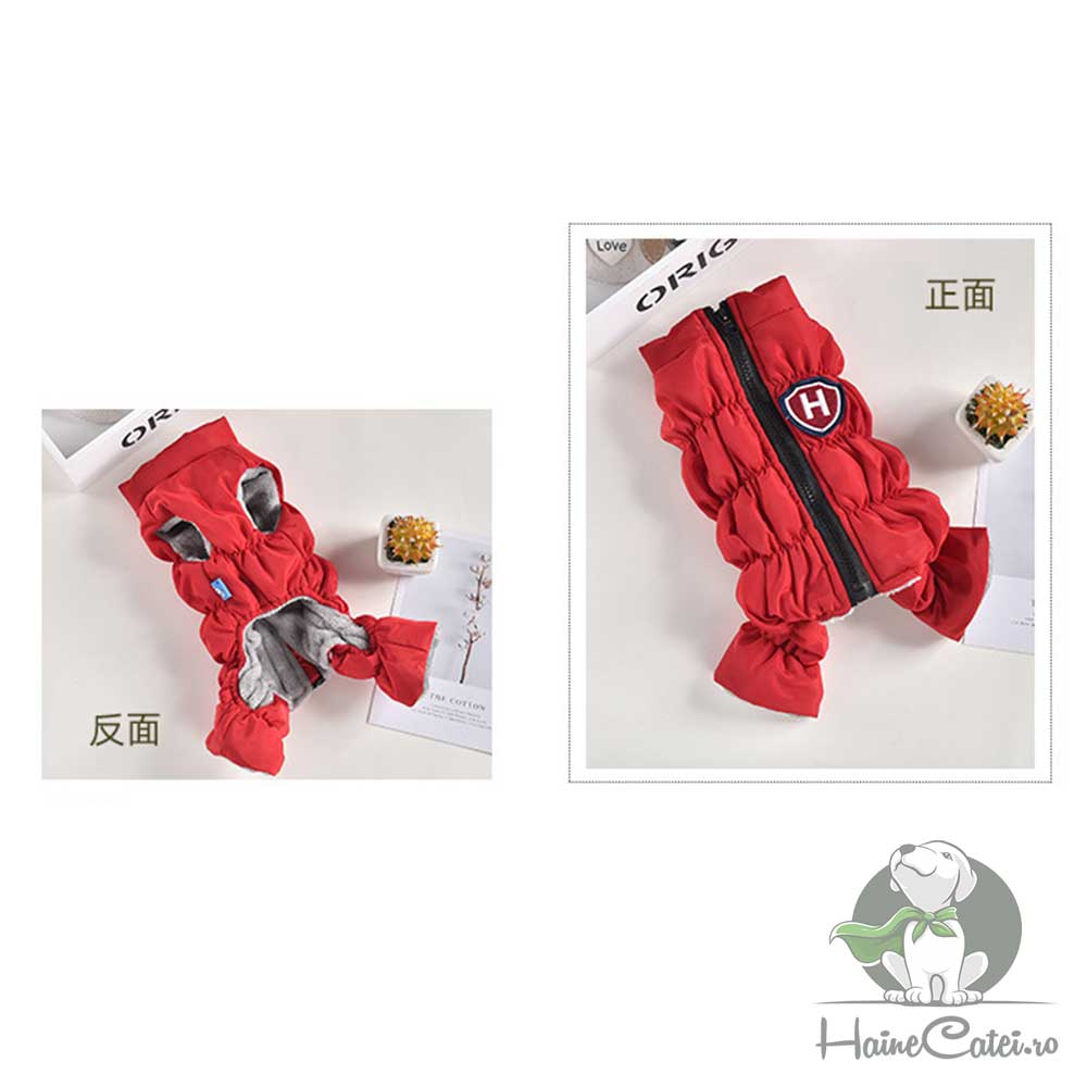 Salopeta îmblănită, impermeabilă, roșie este alegerea ideală pentru plimbările cățeilor în sezonul rece și umed. Pe spate are un patch cu litera „H”, care adaugă un detaliu modern și jucăuș. Materialul exterior rezistă la umezeală, iar interiorul moale oferă căldură și confort. Închiderea cu fermoar pe spate permite o îmbrăcare rapidă și sigură.