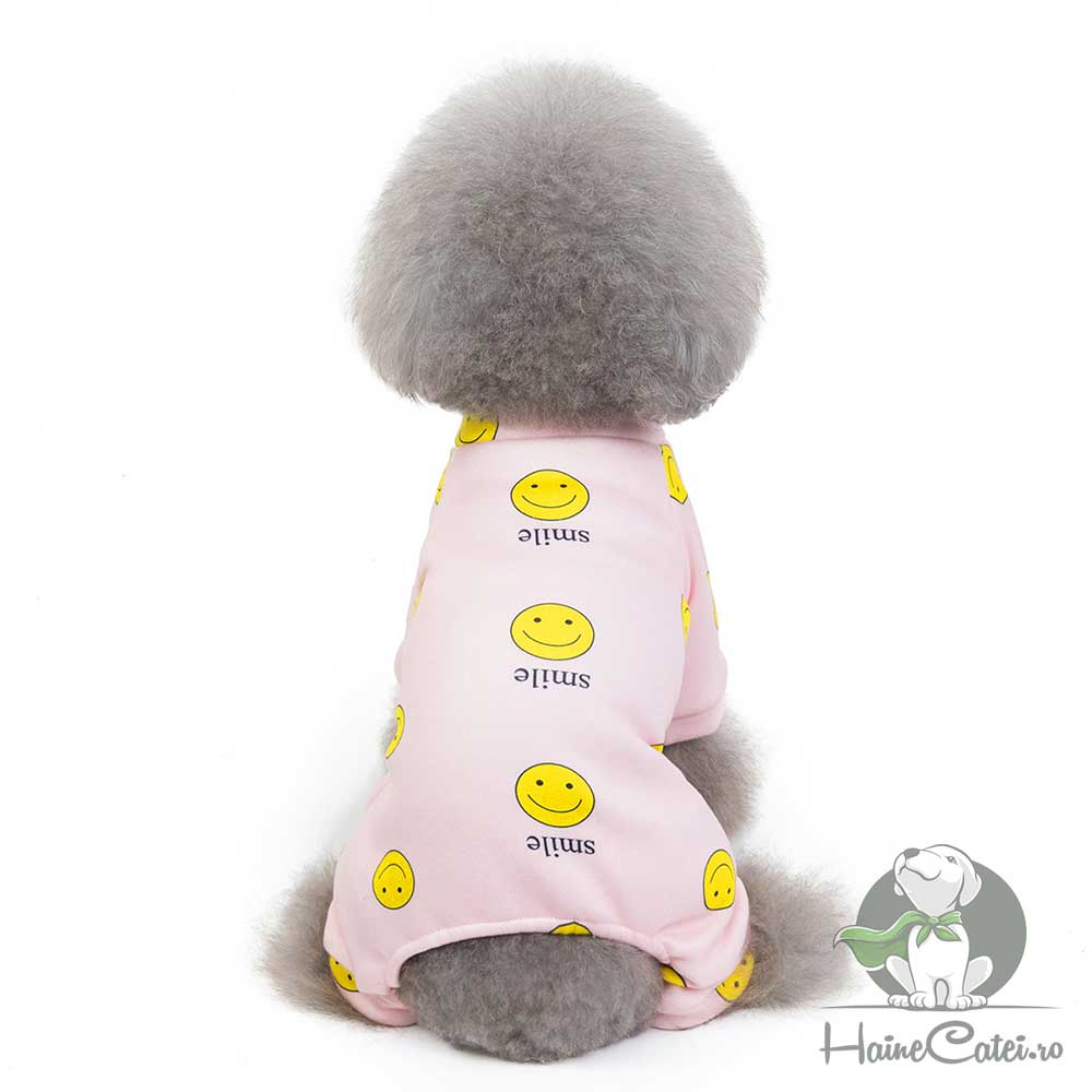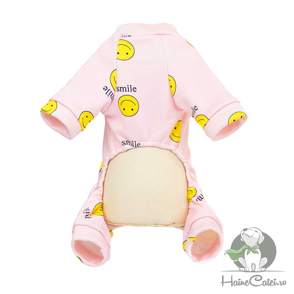 Salopeta roz pentru căței, decorată cu un imprimeu adorabil de Smile, aduce un plus de personalitate și stil în garderoba patrupedului tău. Este confecționată din material moale și comod, iar croiala lejeră permite mișcare liberă. Închiderea cu capse pe burtică face îmbrăcarea rapidă și practică.