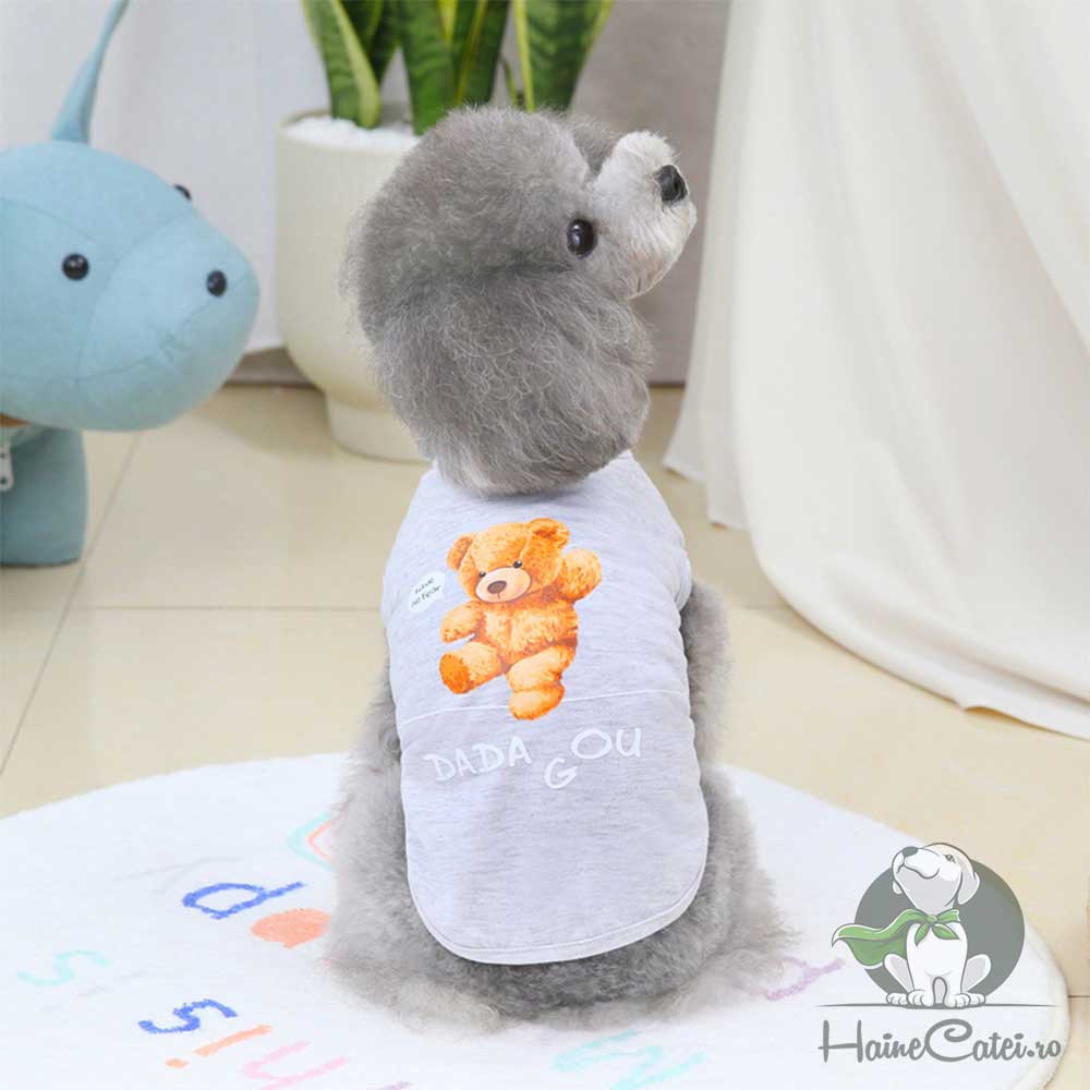 Tricoul gri pentru căței este adorabil și confortabil, perfect pentru plimbări relaxate sau momente de joacă. Pe spate are imprimat un ursuleț simpatic și mesajul „dadagou”, care adaugă un plus de personalitate și farmec. Materialul moale și respirabil îl face ideal pentru purtare zilnică.