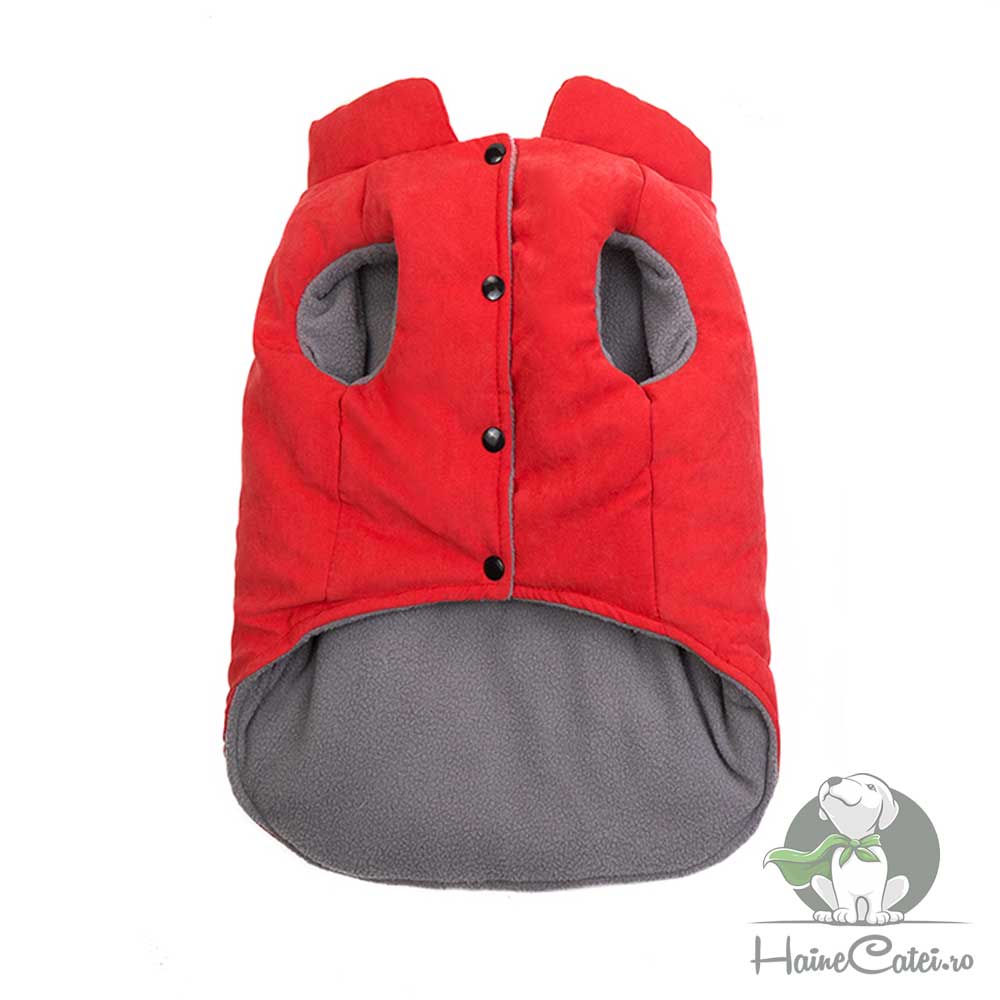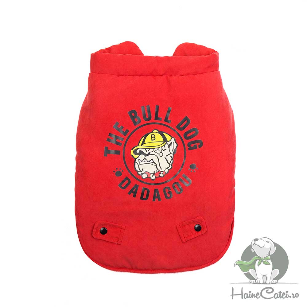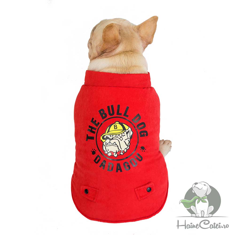 Vesta Bulldog este îmblănită și de culoare roșie, oferind confort și căldură câinelui tău. Pe spate are imprimată o față de câine, alături de textul „The Bulldog Dadagou, care adaugă un plus de personalitate și stil. Se închide rapid și sigur cu capse, asigurând o fixare comodă și practică. Ideală pentru plimbări în zilele răcoroase, vesta protejează eficient împotriva frigului.