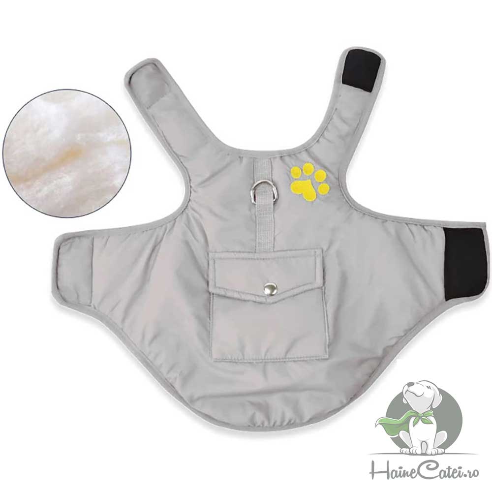 Vesta pentru câini de talie mare este impermeabilă, ideală pentru plimbările în zilele ploioase sau umede. Are o culoare gri vibrantă, completată de un detaliu galben în formă de lăbuță, care adaugă un strop de personalitate. Pe spate se regăsește un buzunar practic, perfect pentru mici accesorii sau recompense.
