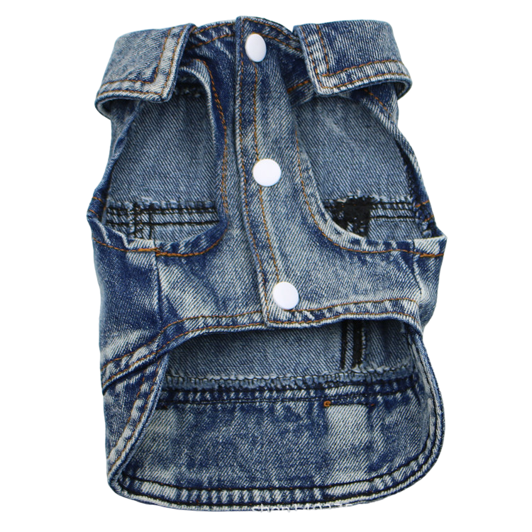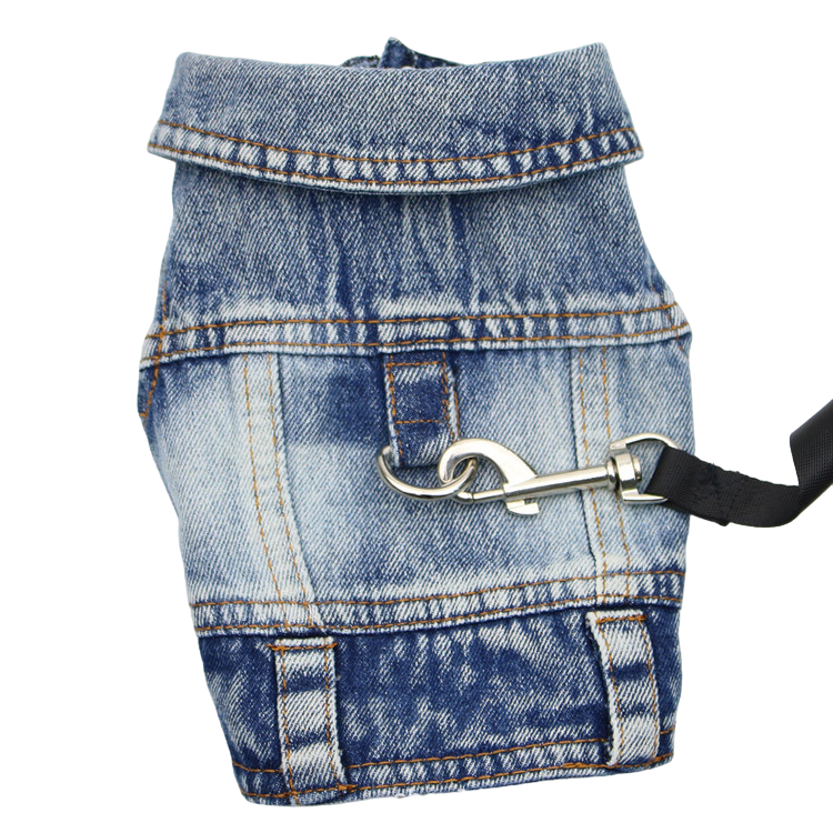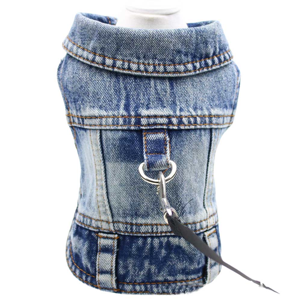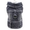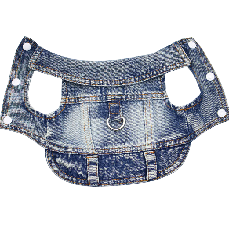 Această vestă pentru câini, confecționată integral din denim, aduce un plus de stil și funcționalitate în plimbările zilnice. Se închide ușor cu capse pe piept și are un inel metalic pe spate, perfect pentru prinderea lesei.