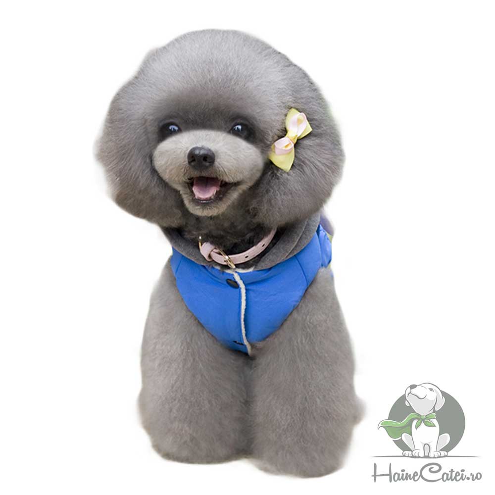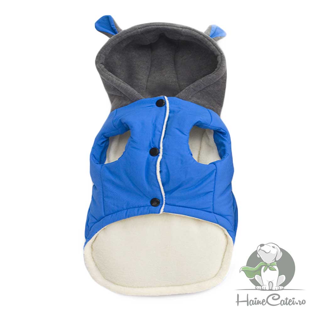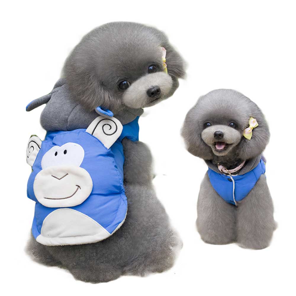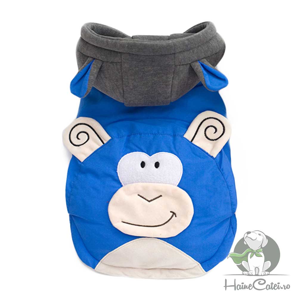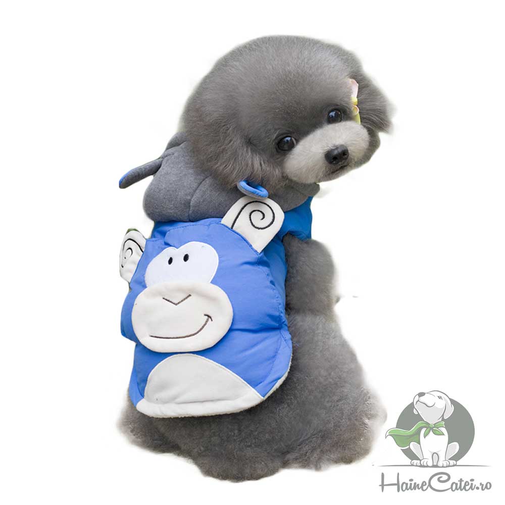 Vestă îmblănită pentru căței, în nuanță de albastru intens, cu un design jucăuș ce include o maimuțică simpatică pe spate. Oferă căldură și confort în sezonul rece, fiind ideală pentru plimbări zilnice. Se închide practic pe burtică cu capse, pentru o utilizare ușoară.