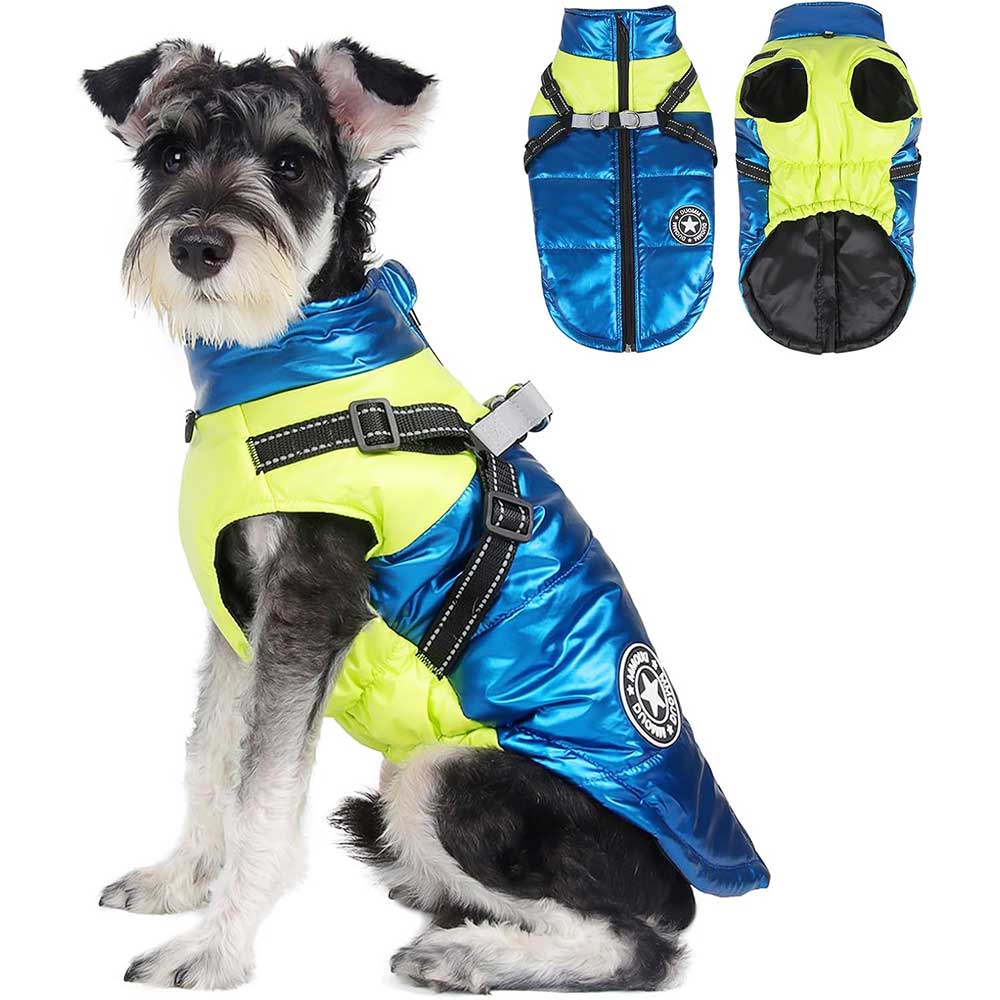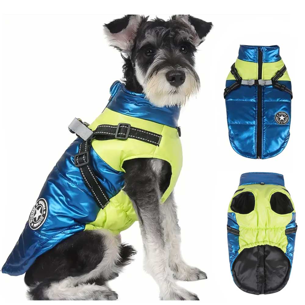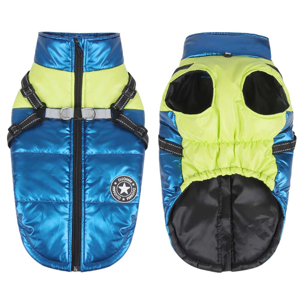 Vestă impermeabilă pentru câini, în nuanțe de albastru și verde neon, cu ham incorporat și inel pentru lesa, oferind un plus de siguranță și confort în timpul plimbărilor. Se închide rapid și sigur cu fermoar pe spate, combinând funcționalitatea cu un design modern și practic.