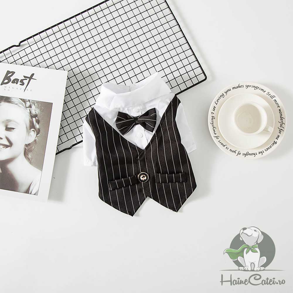Vesta sacou pentru căței neagra cu dungi fine albe, emană eleganță și rafinament. Este accesorizat cu un papion negru și are un guler tip cămașă alb, pentru un aspect clasic și distins. Pe spate, un nasture decorativ completează ținuta, transformând cățelul tău în adevăratul gentleman al oricărei ocazii speciale.